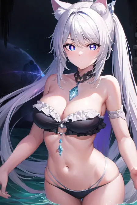 基安娜·卡斯兰娜夏季装扮,双马尾,(明亮瞳孔:1.5),长发,刘海,蓝色眼睛,发饰,肚脐,动物耳朵,泳装,白发,比基尼,猫耳,动物耳朵绒毛,黑色比基尼,