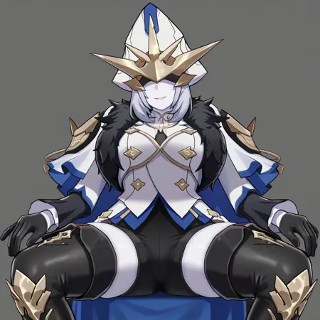 GuaSha_IL, 1girl, solo, mature female, grey hair, colored skin, white skin, helmet, covered eyes, coat, fur trim, black gloves, cape, thighhighs, thigh boots