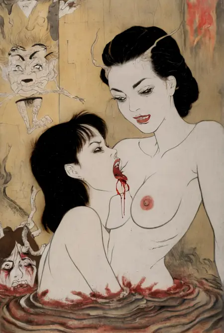monochrome, blood, bleeding, horror \(theme\), retro artstyle, hell, japanese hell,