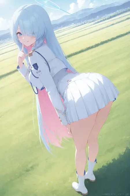 1girl, Arona_the_President, halo, GSC_uniform, blue hair, bangs, covered eye, blue eyes, pink hair, long hair, straight hair, braid, breasts, long_skirt,