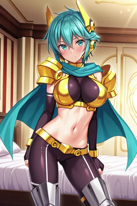 • Yulang Mirage, 1girl, short hair, aqua hair, hair between eyes, aqua eyes, large breasts, gold armor, gold headgear, gold belt, bodysuit, midriff, navel, elbow gloves, fingerless gloves, aqua cape, silver greaves