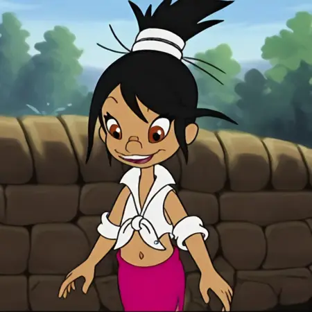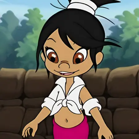 1girl, solo, 4K, medium skin, black hair, burnt orange eyes, black pupils, large upturned nose, extremely upturned nose, very wide nose, concave nose bridge, piggish nose, slightly upturned eyes, short high ponytail, barefoot, 10 fingers, 10 toes, white hair tie, gypsy girl, child, white knotted crop top, long magenta skirt, candela, large feet