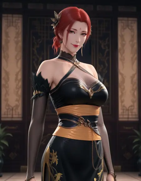 y2fe1,1girl,solo,red hair,short ponytail,jewelry,hair ornament,forehead mark,brown eyes,lipstick,earrings,chinese clothes,bare shoulders,black collar,black halter dress,side slit,yellow waistband,black belt,detached sleeves,bridal gauntlets,high heels,pantyhose,