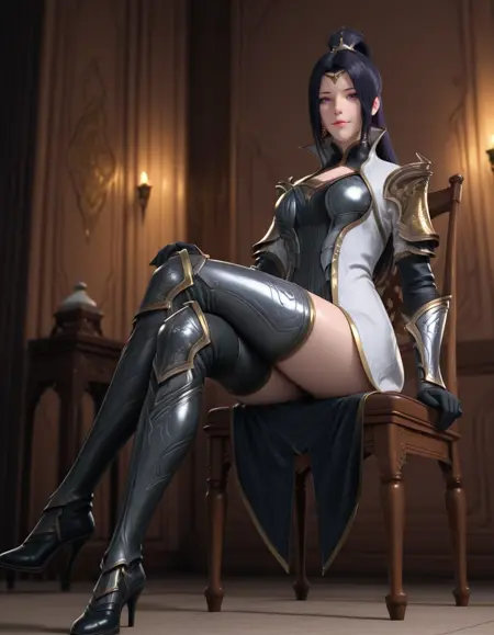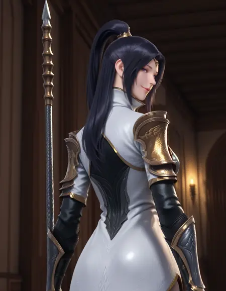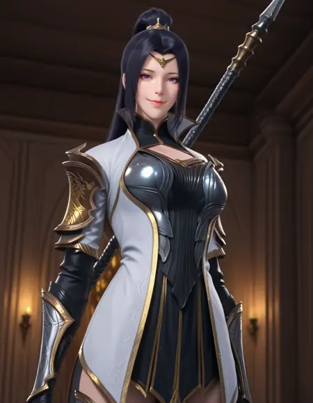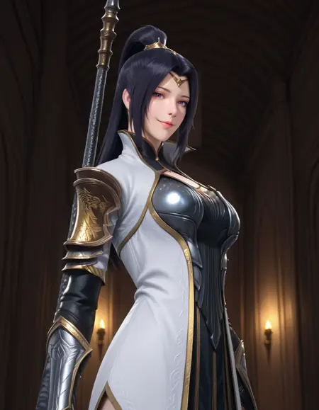 ya2y2,1girl,solo,black hair,long hair,hair ornament,ponytail,purple eyes,lips,jewelry,white coat,black armored dress,bracer,black sleeves,black collar,shoulder armor,gloves,leg armor,boots,high heels,spear,