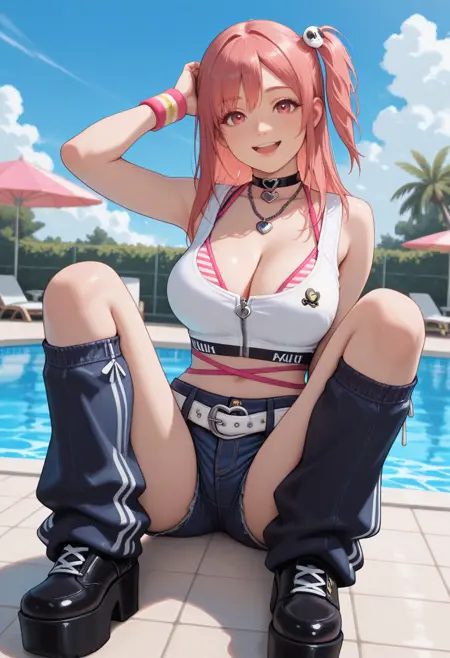 "PPR1SMHON, pink hair, pink eyes, long hair, side ponytail, skull hair ornament,black choker, heart collar, necklace, white sports bra, striped bikini under clothes, zipper, cross-laced clothes, sweatband, denim shorts, white belt, pink belt, "