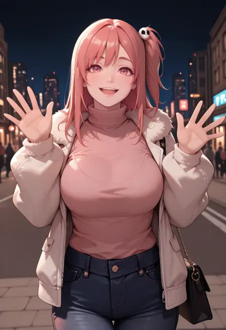 "D04HON0K4, pink hair, pink eyes, long hair, side ponytail, skull hair ornament"