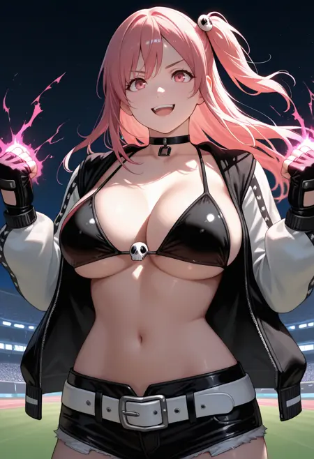 "ALTN0K, pink hair, red eyes, long hair, side ponytail, skull hair ornament,black choker, black and white open jacket, black bikini top, black short shorts, white belt, torn thighhighs, fingerless gloves, "