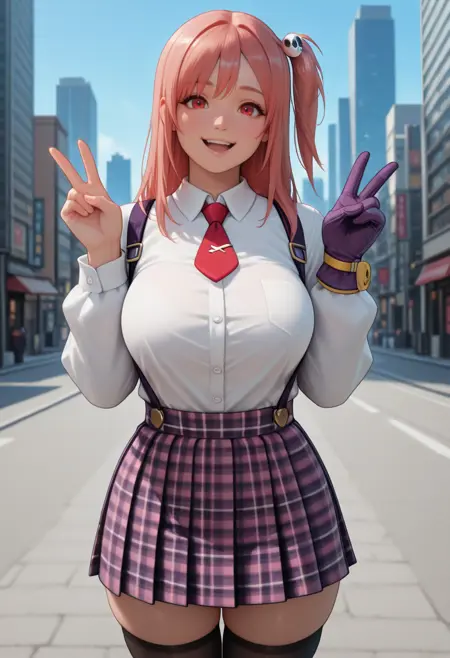 "D04HON0K4, pink hair, red eyes, long hair, side ponytail,skull hair ornament, purple blazer, white collared undershirt, red necktie, long sleeves, single purple glove, plaid skirt, white thighhighs, "