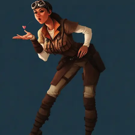 jan ors \(star wars\), dark brown hair, long hair, ponytail, brown eyes, goggles on head, vest, undershirt, belt, pouches, pants, heels, large breasts, 1girl, solo