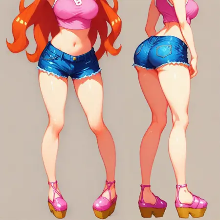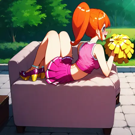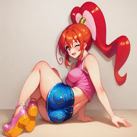 MidorisSmttcg, red hair, haatoz hair, yellow hairtie, red eyes, sleeveless shirt,pink sleeveless shirt, crop top, denim skirt, wedge, pink wedge,