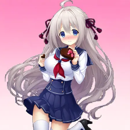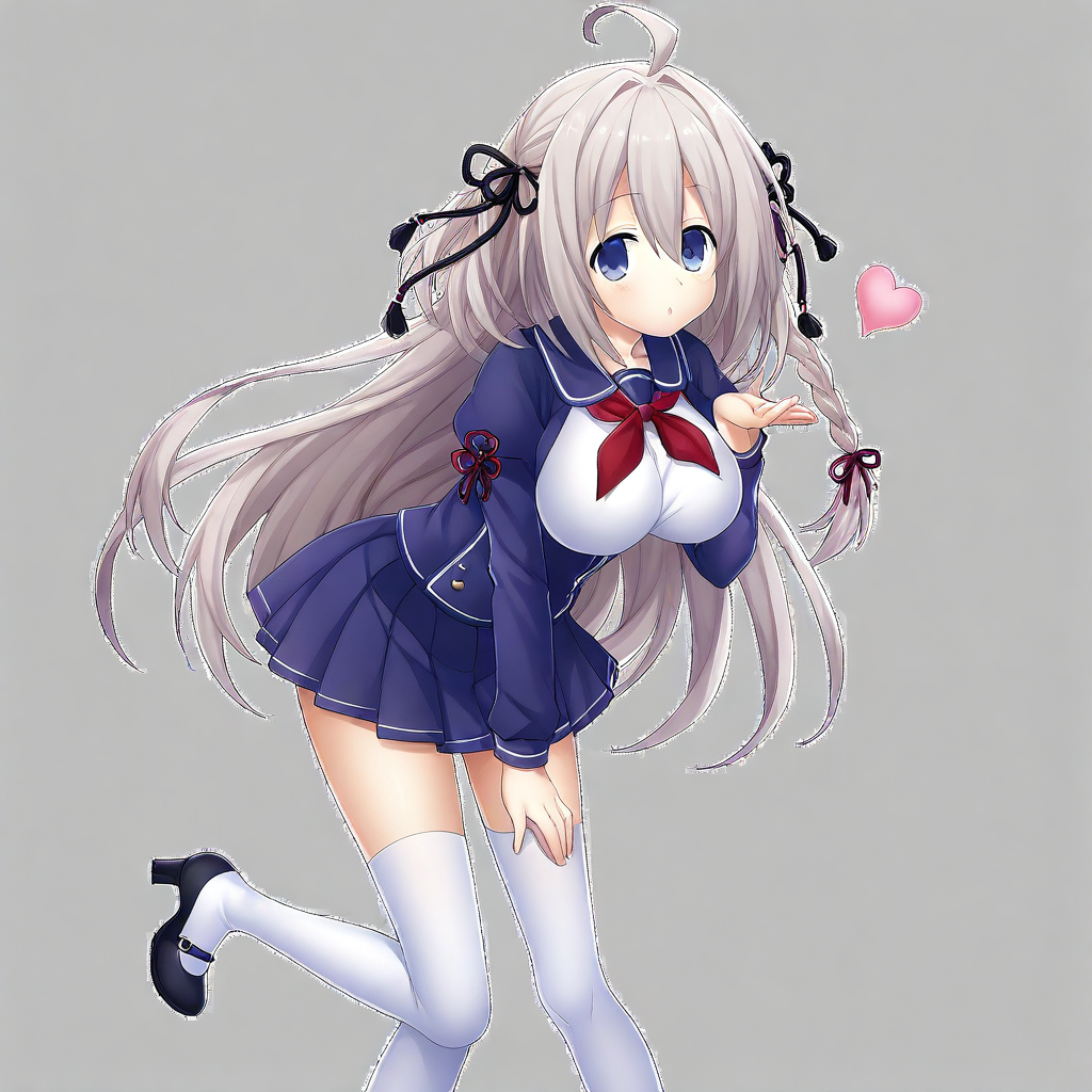 kuki asahi \(flower knight girl\), grey hair, long hair, ahoge, hair between eyes, hair ribbons, blue eyes, school uniform, skirt, neckerchief, thighhighs, heels, large breasts, 1girl, solo