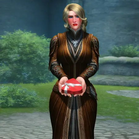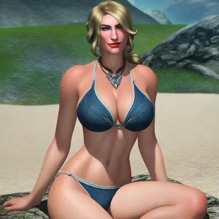 gisli \(skyrim\), blonde hair, long hair, blue eyes, lipstick, necklace, jewelry, dress, skirt, heels, large breasts, 1girl, solo