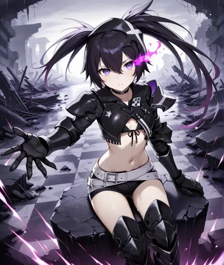 角色标签:IBRSBase,苍白皮肤,紫色眼睛,燃烧的眼睛,紫色火焰,黑发,长发,双马尾,不对称双马尾,头饰,黑色项圈,小胸,疤痕,缝合线,链条,星星(符号),盔甲,黑色夹克,短款夹克,黑色短上衣,腹部,肚脐,臂甲,黑色护腕,爪子,黑色短裤,超短裤,两条腰带,白色腰带,松散的白色腰带,黑色长筒袜,黑色铠甲腿部护具,大腿靴,黑色铠甲靴,