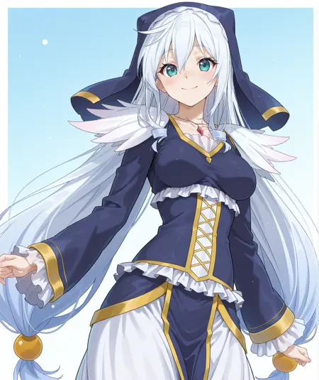 - 睫毛、鼻子、腮红、微笑、长发、蓝眼睛、头发遮住眼睛、极长发、白发、灰发、青色眼睛、钻头发型、低扎长发,