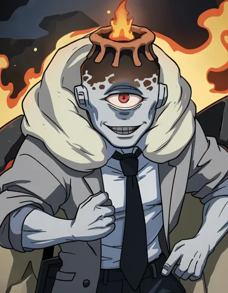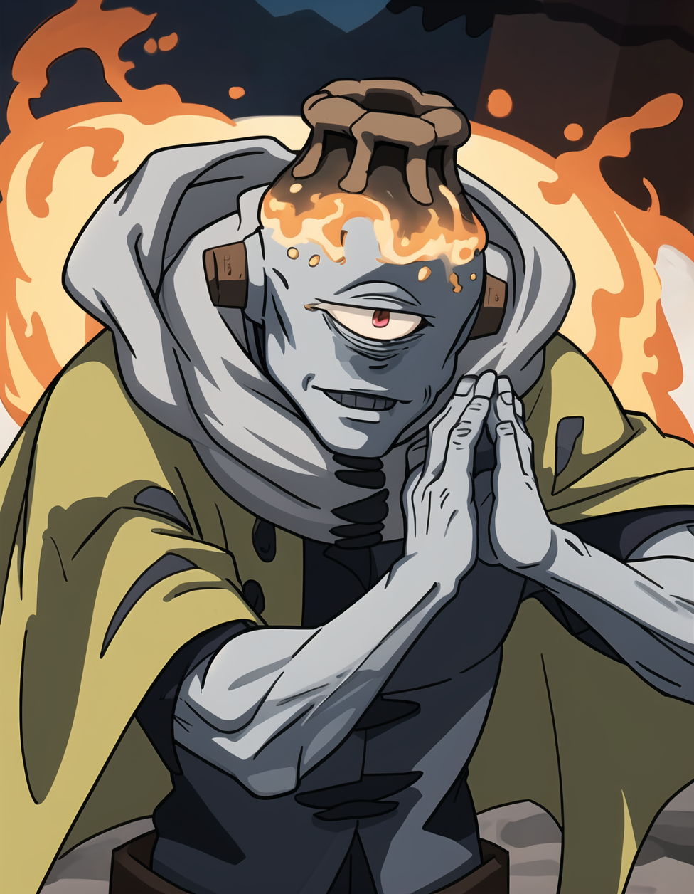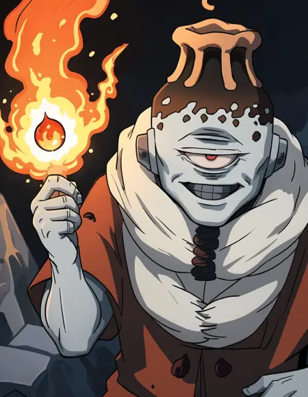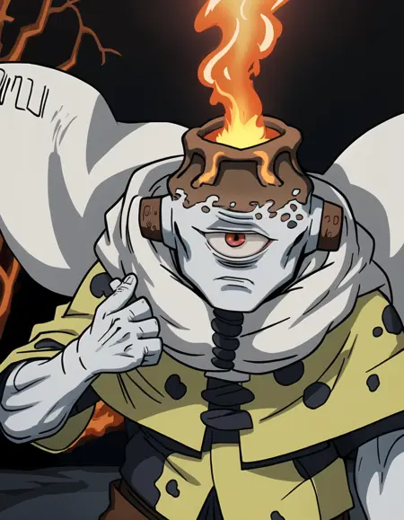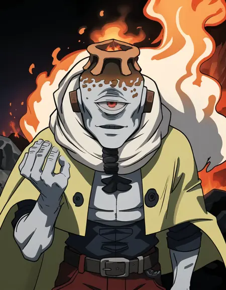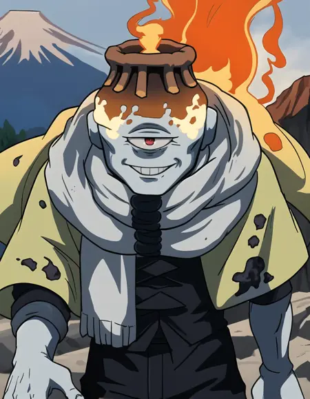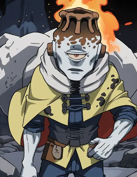 状況別プロンプト:1boy、solo、smile、male focus、boots、colored skin、grey skin、one-eyed、cyclops、volcano head、tube ears、yellow cape、scarf