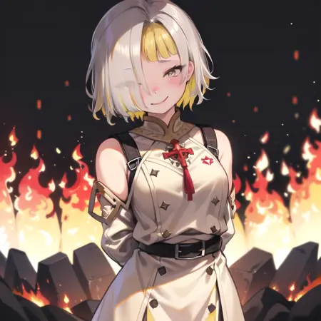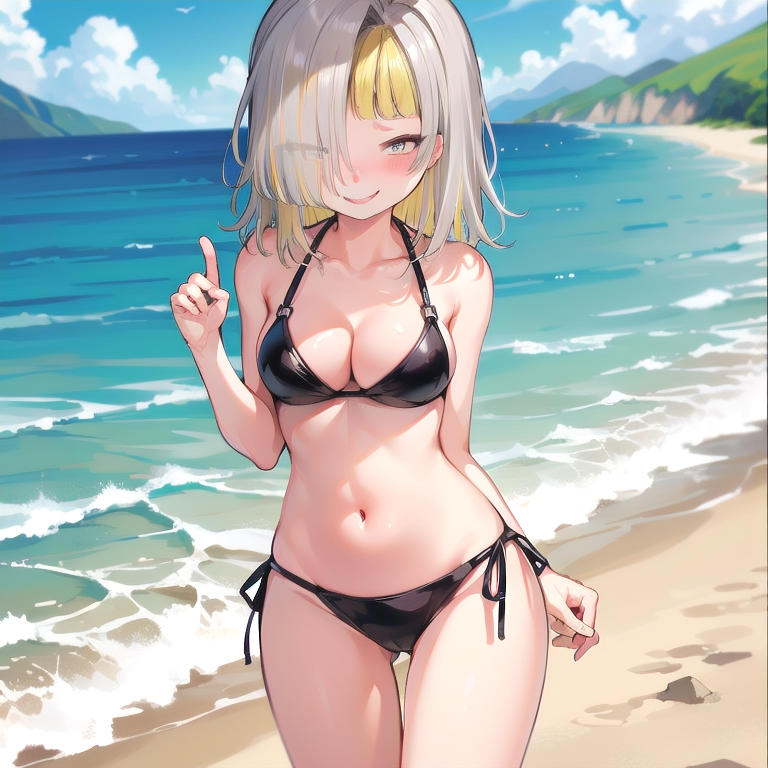 masterpiece, best quality, 1girl, smile, blonde hair, hair over one eye, multicolored hair, grey eyes, lora:Kromer:1
