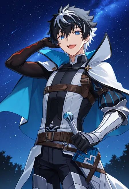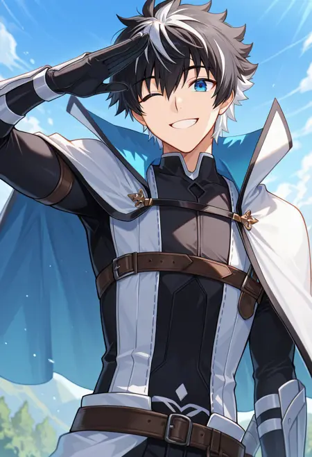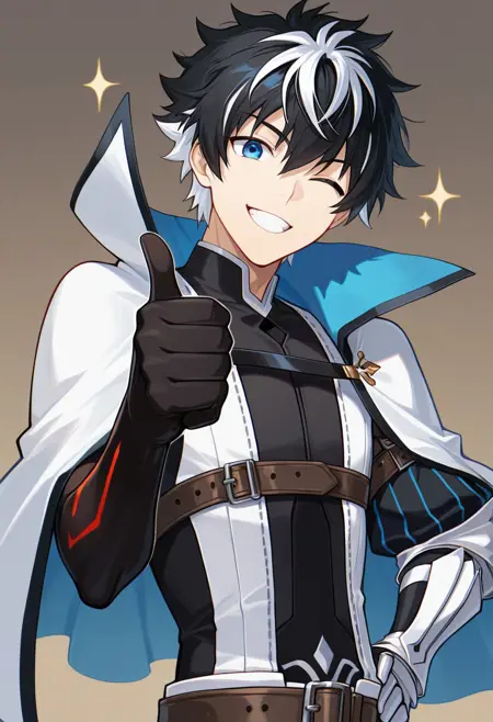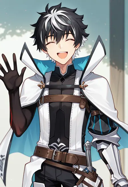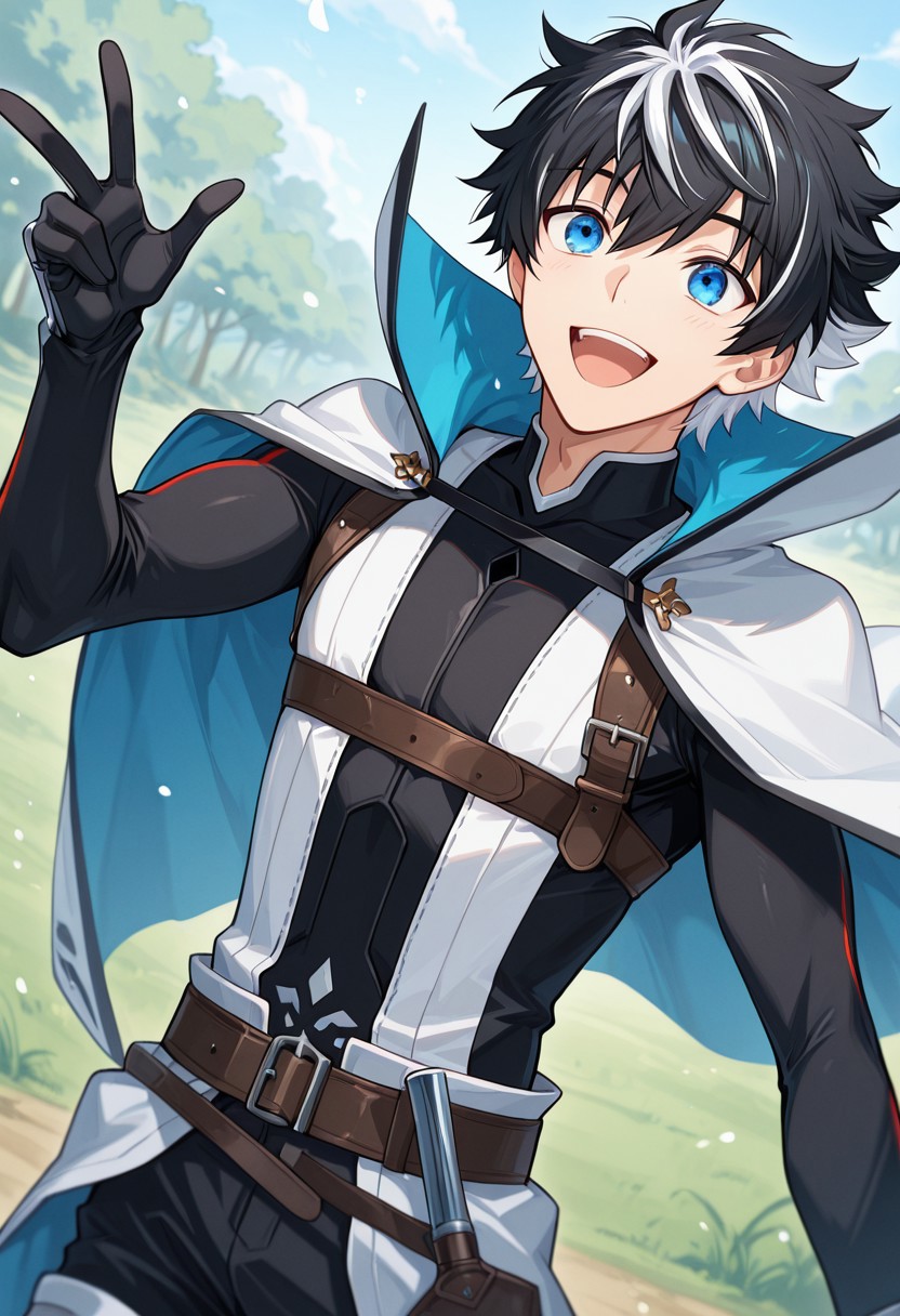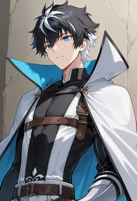 1boy, male focus, solo, blue eyes, multicolored hair, black hair, white hair, black bodysuit, white cape, high collar, single gauntlet, belt, armored boots, white footwear,