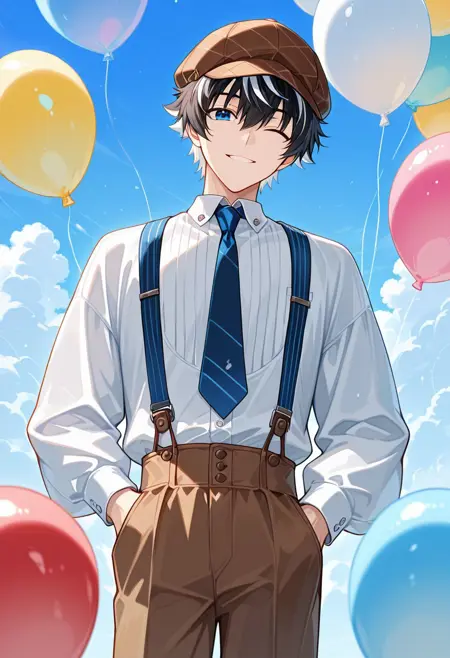 1boy, male focus, solo, blue eyes, multicolored hair, black hair, white hair, cabbie hat, brown headwear, dress shirt, white shirt, brown necktie, blue suspenders, brown pants, shoes,