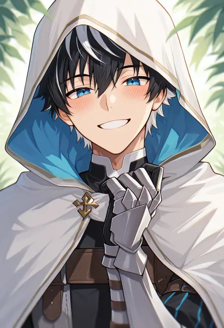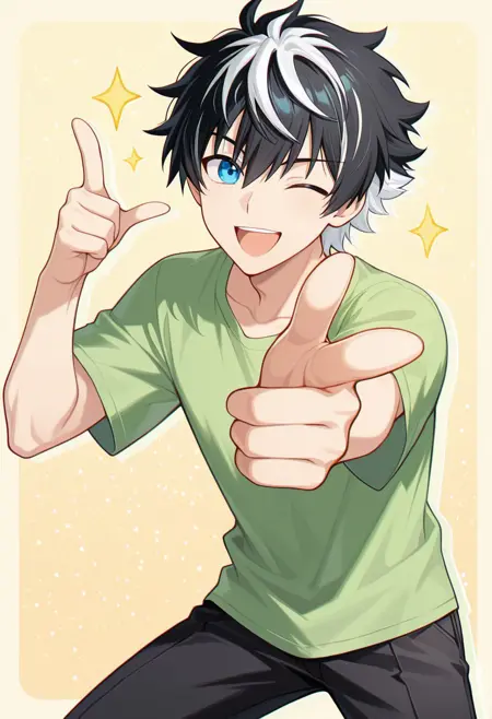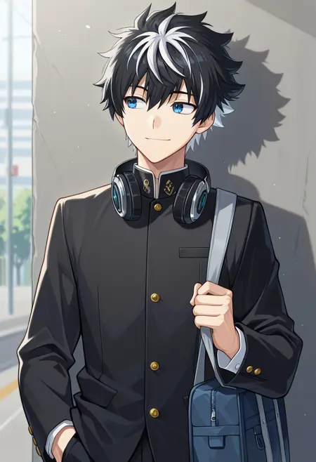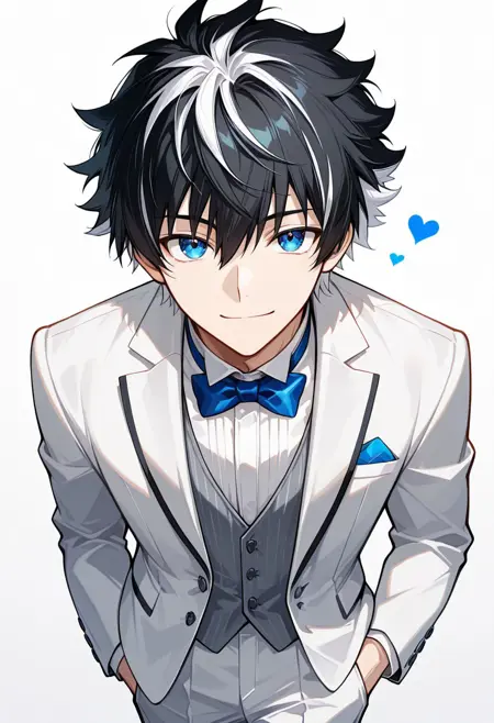 1boy, male focus, solo, blue eyes, multicolored hair, black hair, white hair, white shirt, blue bowtie, white jacket, grey vest, white pants,