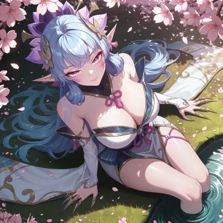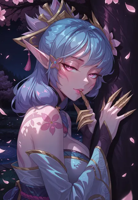 SBevelynn,blue hair,hair ornament,pointy ears,bare shoulders,japanese clothes,kimono,pink eyes,face marks,heels,stockings,claws,detached sleeves,tattoo,