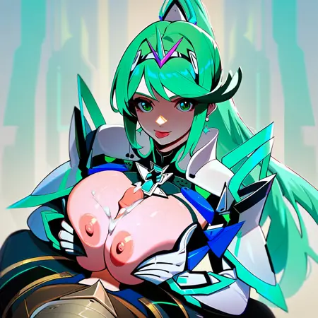 (Xenoblade_Pneuma, long hair, green hair, ponytail, bangs, green eyes, earrings, chest jewel, tiara, gloves, bodysuit, armor, high heels),