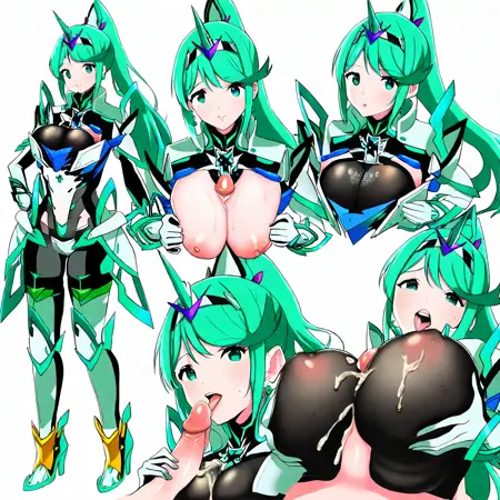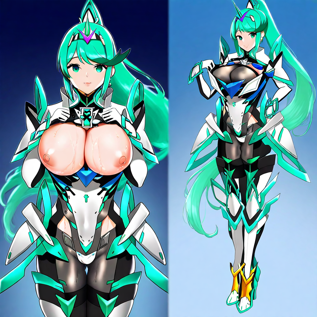 (Xenoblade_Pneuma, 긴 머리, 녹색 머리, 폴테일, 앞머리, 녹색 눈, 귀걸이, 가슴 보석, 관모, 장갑, 바디수트, 갑옷, 하이힐),