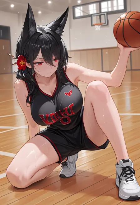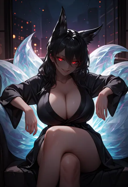 Omnet, red eyes, mole under eye, animal ears, long hair, black hair, hair between eyes, animal ear fluff, huge breasts, pasties, fox tail, multiple tails, crystal tail, cuffs, fishnet bra, black thong, thigh strap, black thighhighs, kunai,