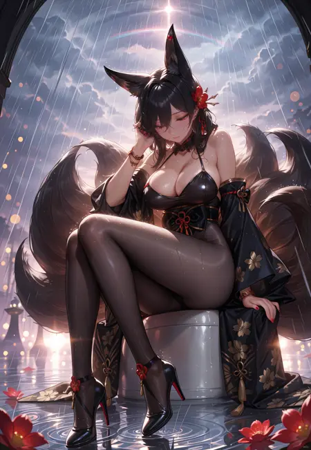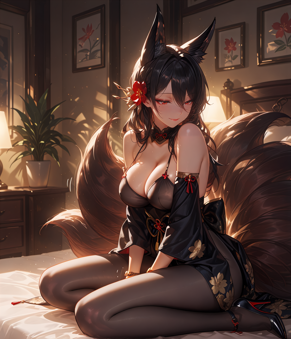Omstand, red eyes, mole under eye, animal ears, fox ears, long hair, black hair, hair between eyes, animal ear fluff, red flower, hair flower, hair ornament, large breasts, detached collar, cleavage, bare shoulders, gold bracelet, detached sleeves, breastless leotard, waist bow, black bodysuit, wide sleeves, print sleeves, floral print, gold trim, red nails, fox tail, brown tail, multiple tails, black high heels,