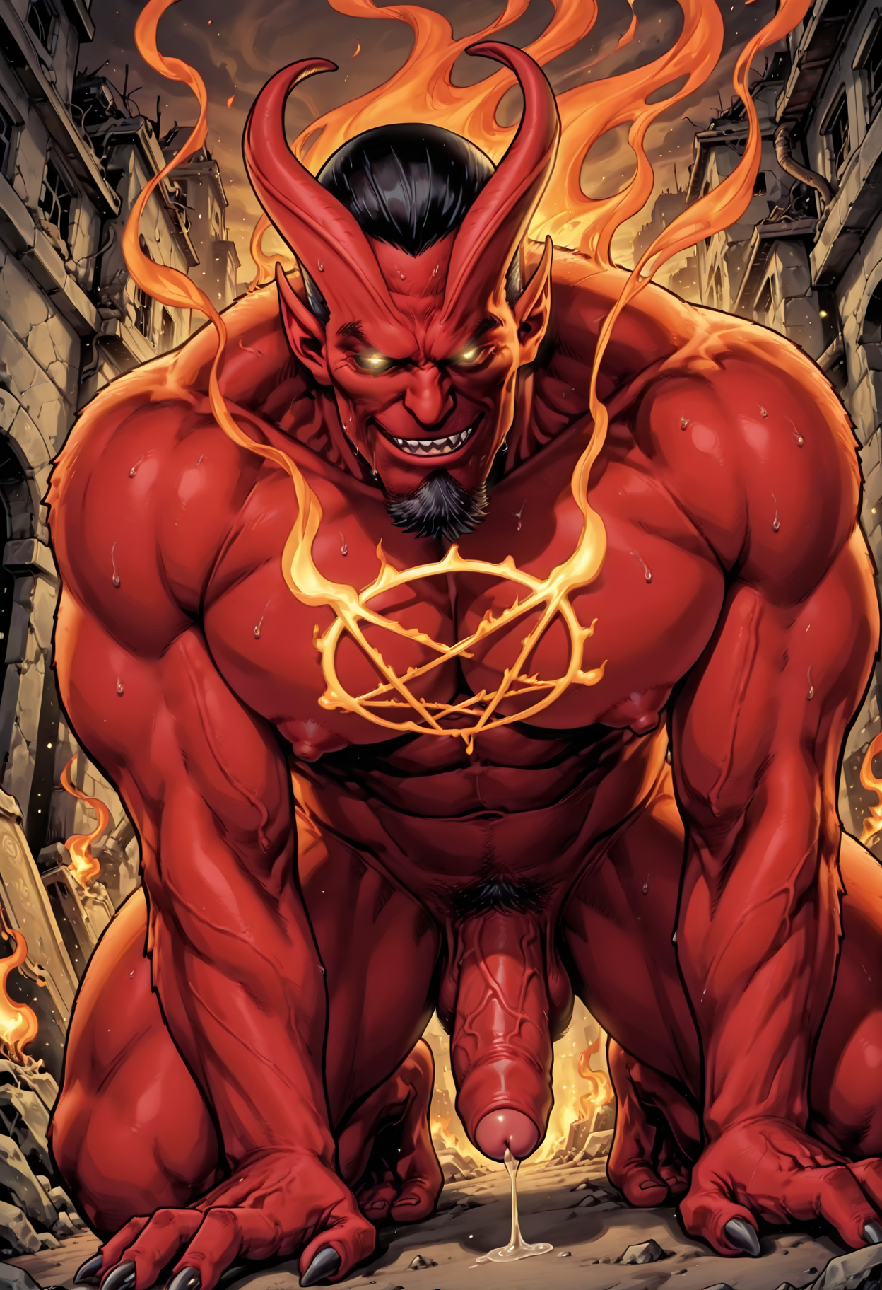 Sabbac, mature male, demon, Black hair, slick back hair, glowing eyes, black sclera, goatee, Red horn, Red skin, Pointed ears, Black nails, claws, There is a flame reverse pentagram pattern on the chest,