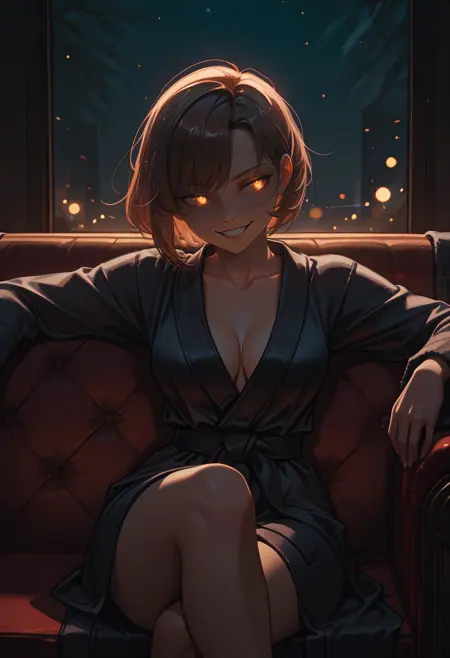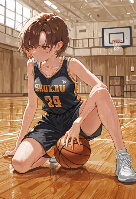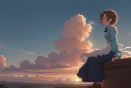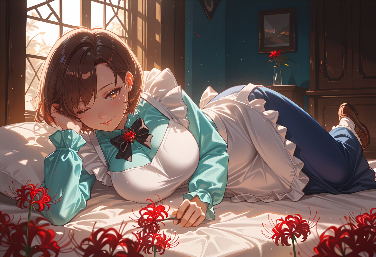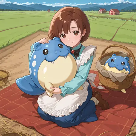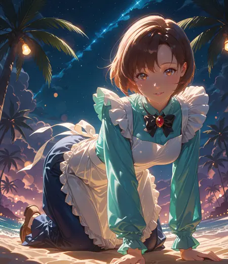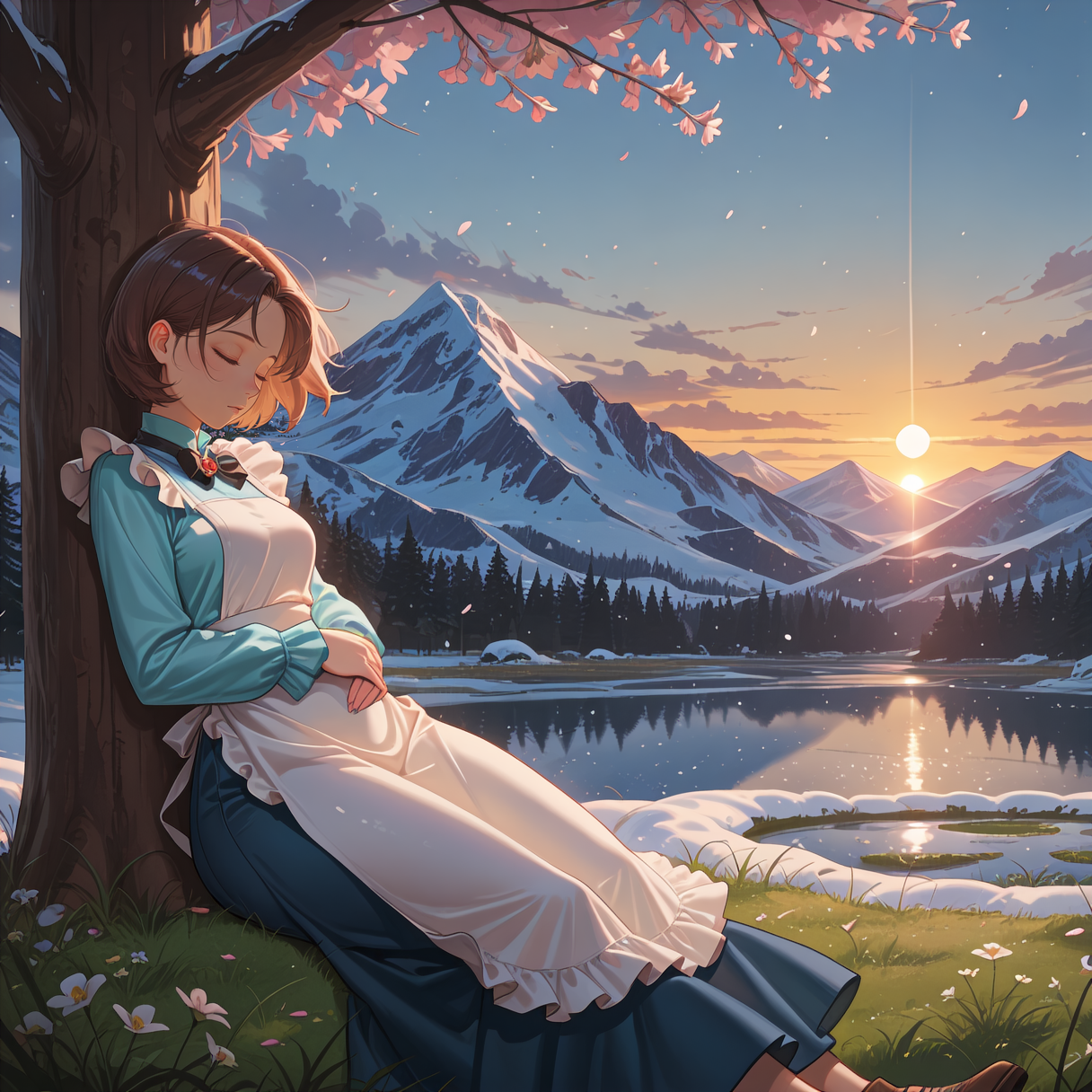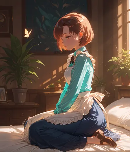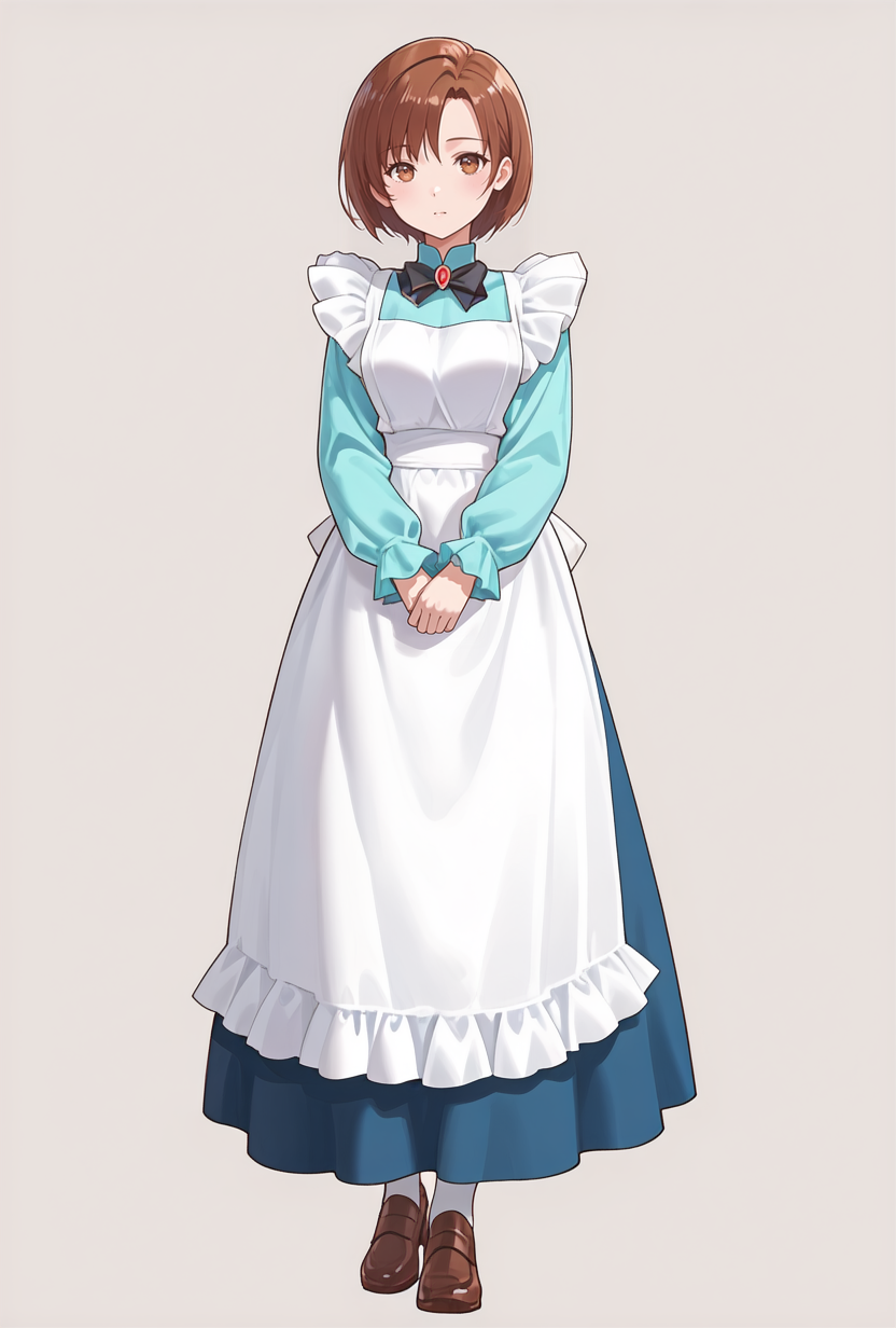 ELHARV, brown eyes, brown hair, short hair, medium breasts, brooch, light blue shirt, long sleeves, dark blue skirt, long skirt, frills, black bowtie, apron, brown shoes,