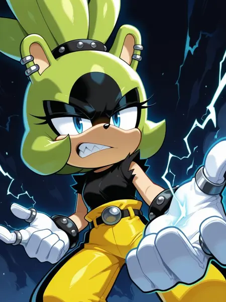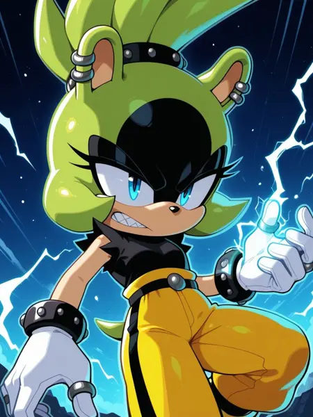 Surge The Tenrec, Green Fur, Black Face, Blue Eyes, Topknot, Ponytail, Studded Hair Tie, Studded Wristband, White Gloves, Black Shirt, Ripped Sleeves, Belt, Baggy Yellow Pants, Yellow Sneakers, Multiple Rings, Ear Piercing, Sharp Teeth, Electrokinesis,