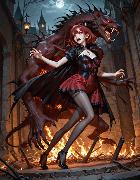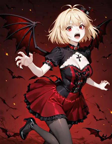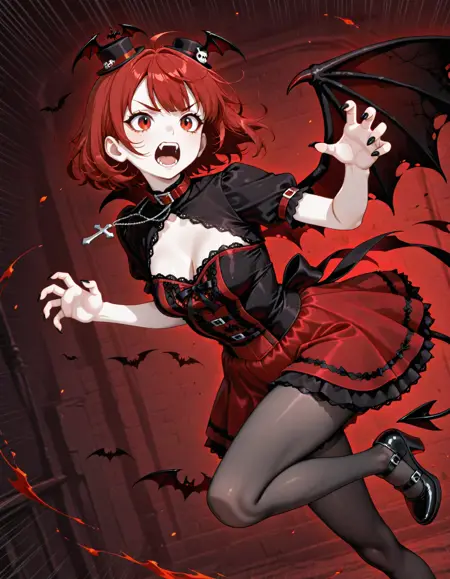 触发词:RedVampire、gothic、cosplay、black top、red skirt、hat pin、buckle、two-tone corset、black tights、high heels、mini hat、red collar、black lace、black puffy sleeves、lace trim。