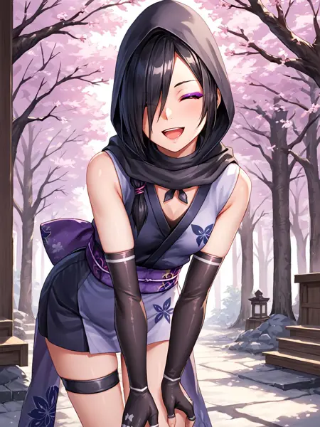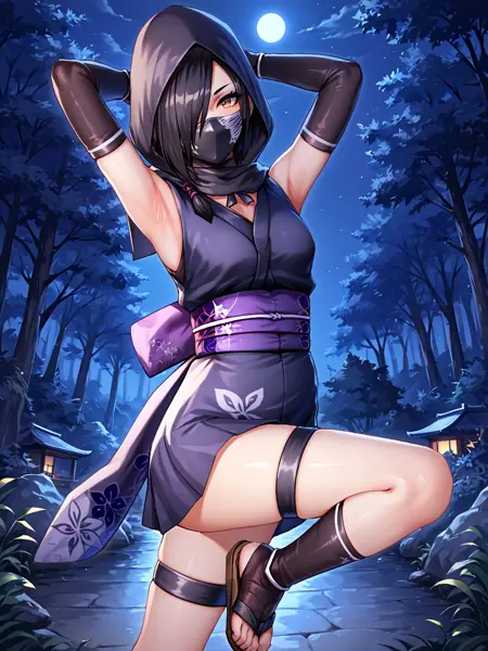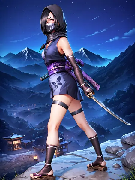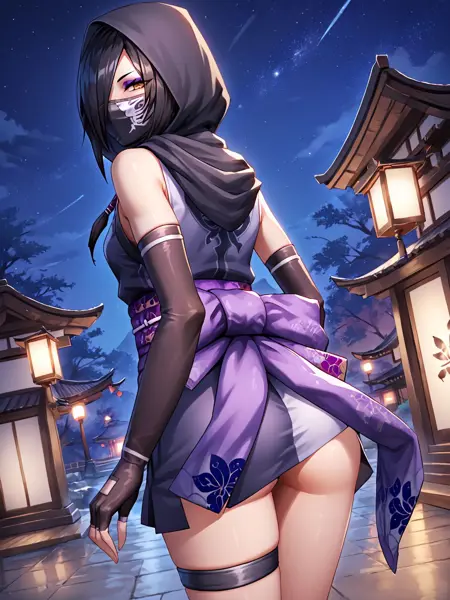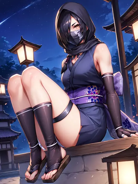 ninja,black hair,brown eyes,hair over one eye,eyeshadow,purple eyeshadow,breasts,small breasts,bare shoulders,mask,mouth mask,covered mouth,ninja mask,japanese clothes,kimono,short kimono,obi,elbow gloves,fingerless gloves,gloves,hood,skirt,sandals,socks,black legwear,toes,thigh strap,