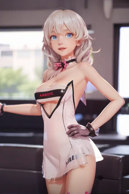 此时对脸部及脸部LoRA的影响最小,同时可编辑dress属性,例如材质、样式、颜色(如see-through red rubber dress),也可与其他部分服装LoRA搭配使用,将服装改为带有铭牌的胸腰带连衣裙(最好为完整上衣,否则会生成抹胸式bra)。