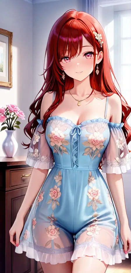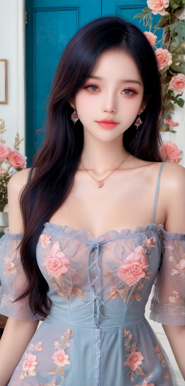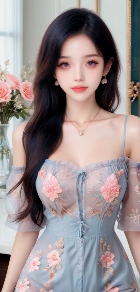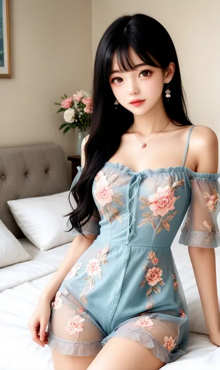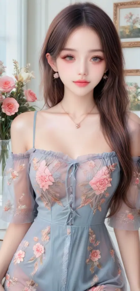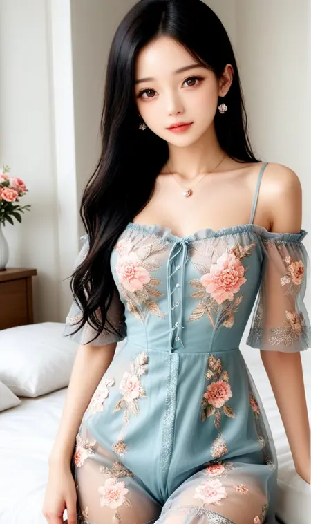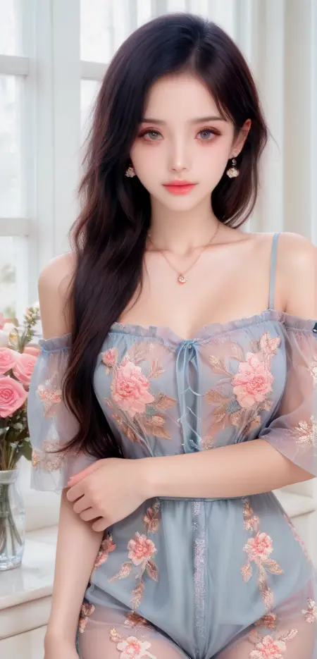 提示词:flower_pajamas, jewelry, necklace, see-through, floral print