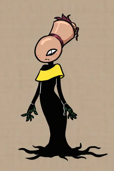 VseFNF vase-shaped beige head, Singular wide black eye, bright yellow shirt, black inky body,