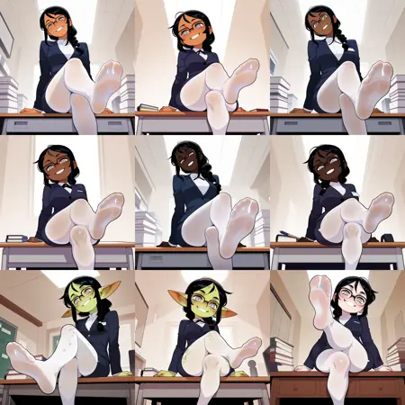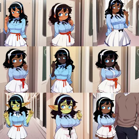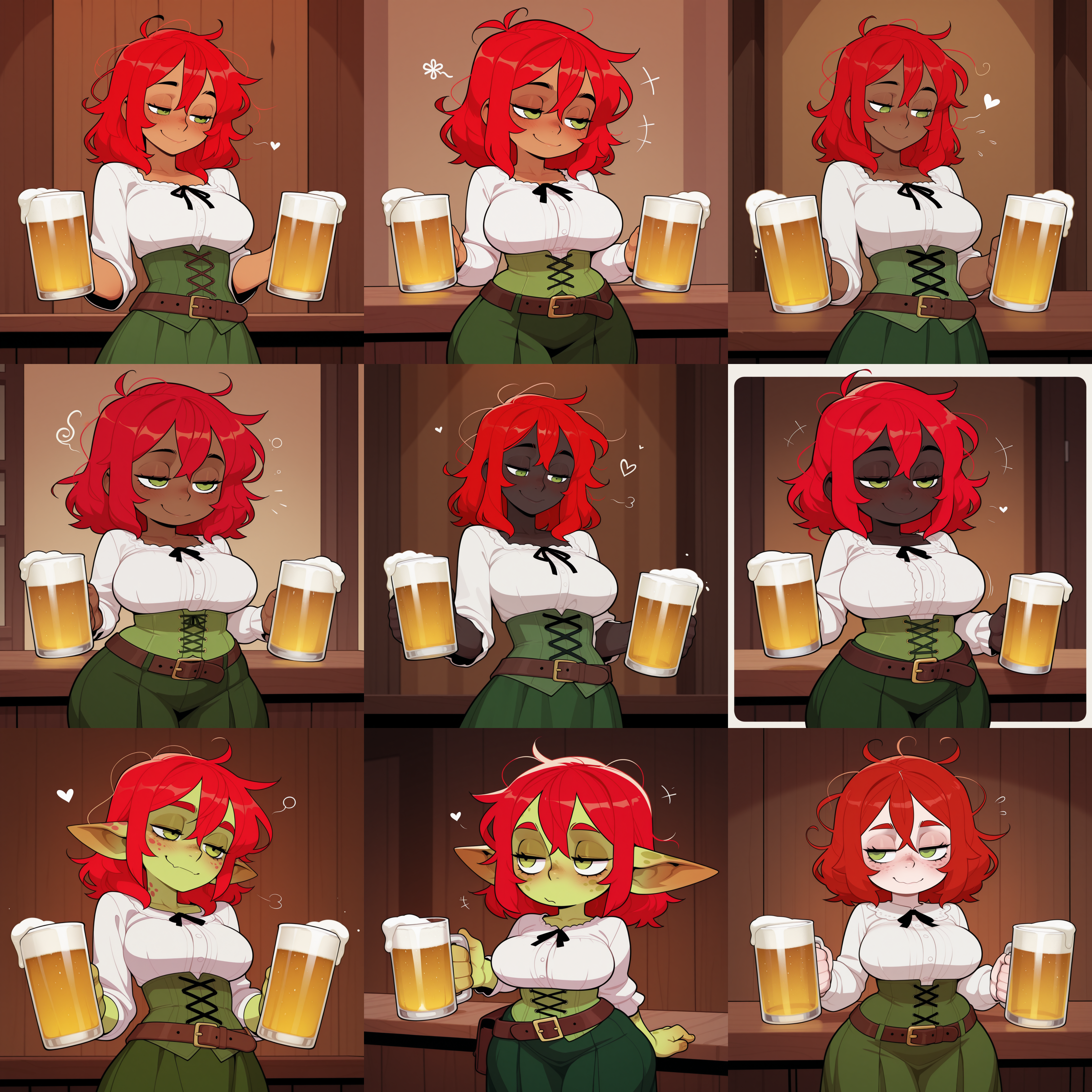 The magic here comes from me trying to enhance my desire for skin tone distinction while also throwing goblin girls into the mix. I wanted to be able to make proper shortstack gobbos, but was disappointed that 'shortstack' as a tag on the checkpoints I use would not do much most of the time. So I split my data set into girls with no skin tone tag. 'tanned' girls, 'dark skin' girls, 'very dark skin' girls and 'green skin, goblin girl, pointy ears, spotted skin, shortstack' girls.