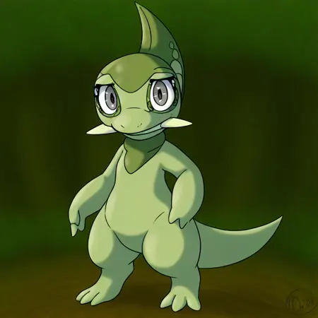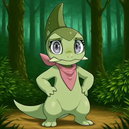 pokemon (creature), axew, scalie, dragon, green skin, grey eyes, tusks, single horn, tail, Pink neckerchief,
