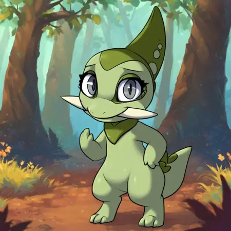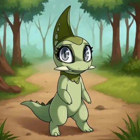 pokemon (creature), axew, scalie, dragon, green skin, grey eyes, tusks, single horn, tail, Pink neckerchief,