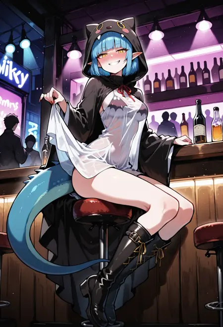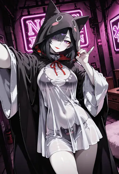 animal hood,black cape,long cape,hood,white dress,short dress,transparent dress,long sleeves dress,turtleneck dress,wide sleeves,bat bra,bat panties,bra under dress,