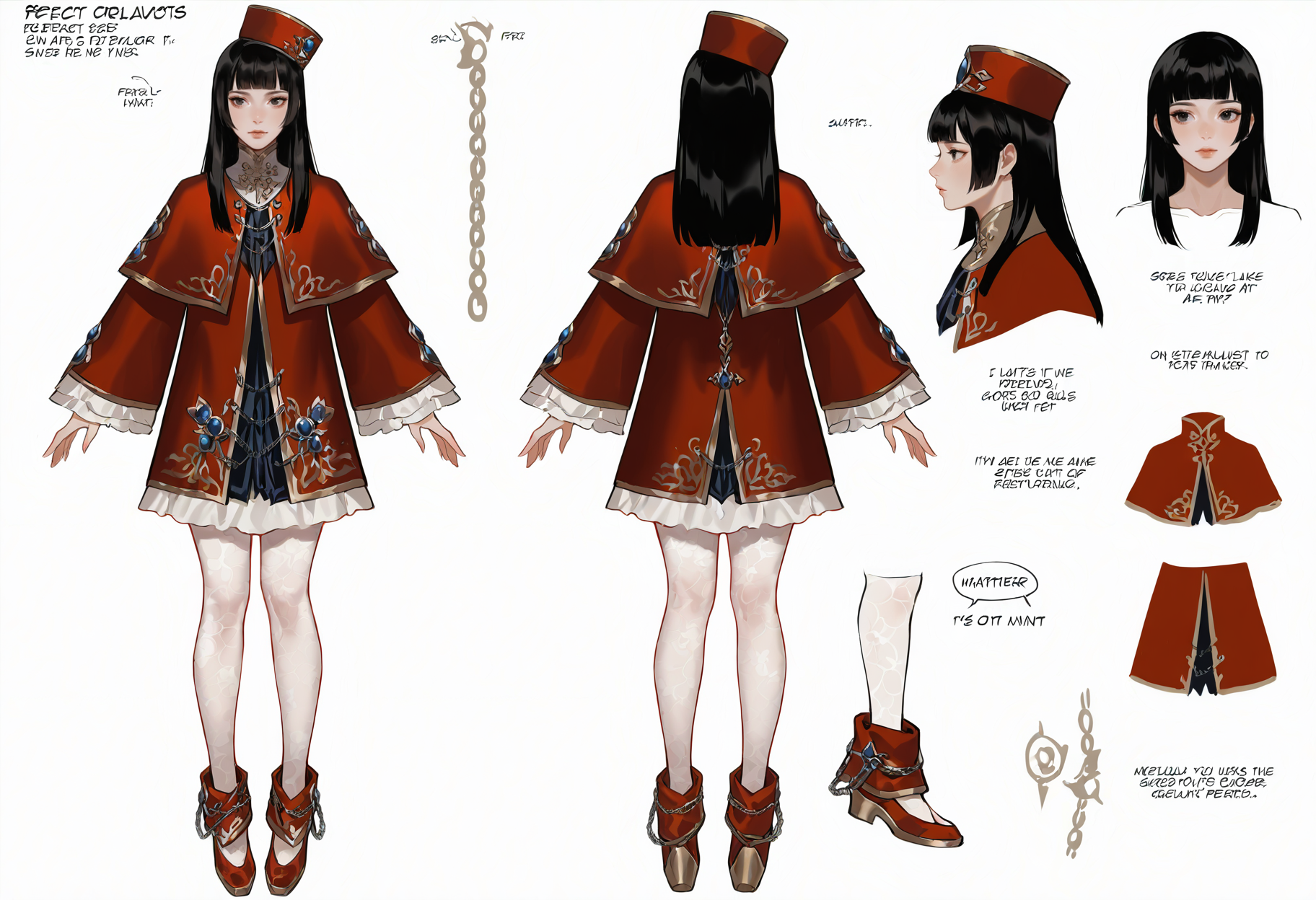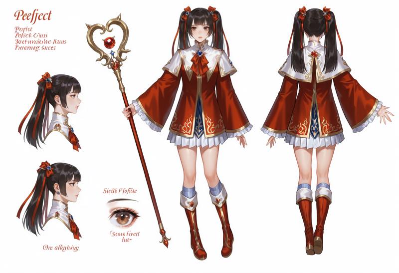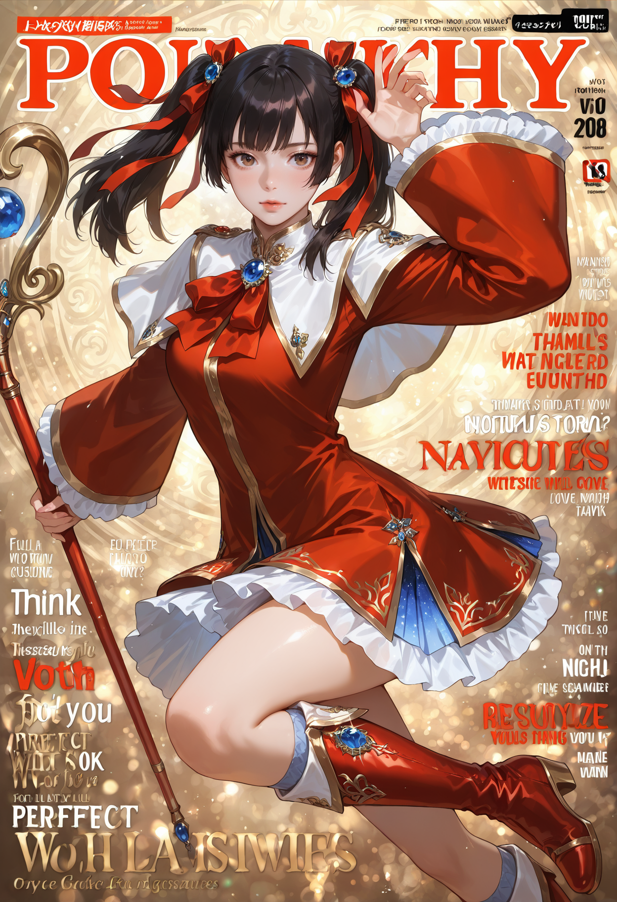 DW7 オリジナル衣装: 1girl,茶色の目,ツインテール,ショートヘア,ロングヘア,前髪,黒髪,髪飾り,髪リボン,ブーツ,膝上ブーツ,スカート,ロングスリーブ,膝丈ソックス,リボン,靴下,ドレス,プリーツスカート,ジュエリー,ブローチ,宝石,赤いドレス,赤い靴,カプセル,ワイドスリーブ,フリル,所持,Staff