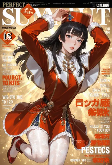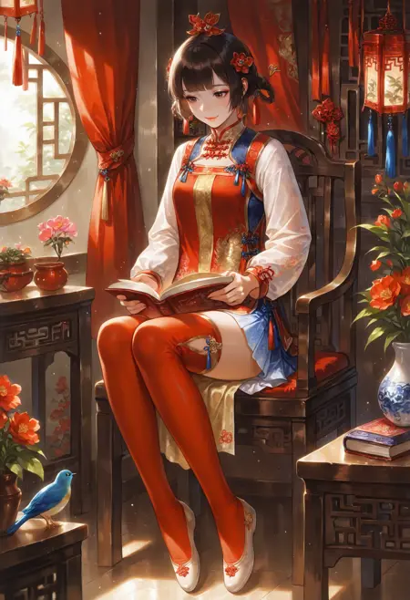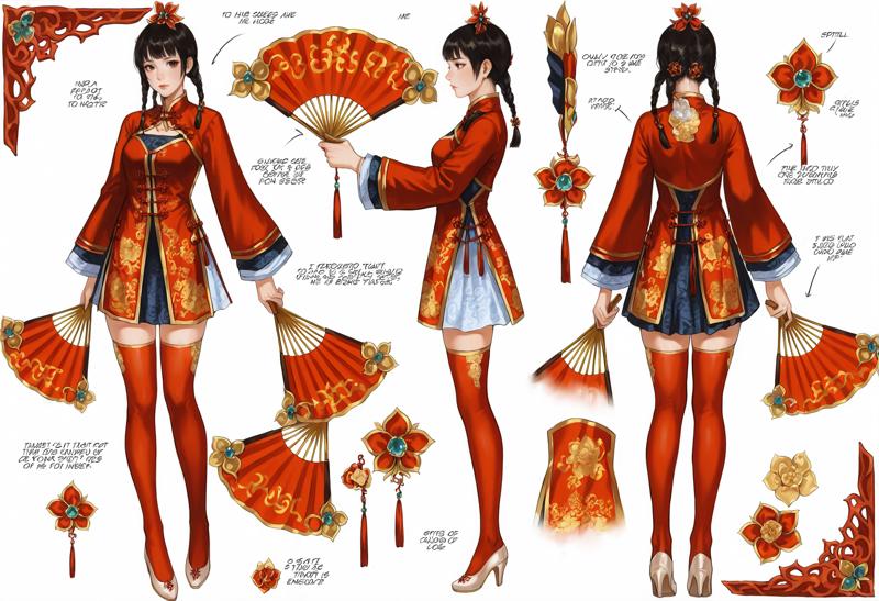 DW4 オリジナル衣装: 1girl,黒い目,茶色の目,ツインバインド,バインド,黒髪,太ももハイズ,赤い太ももハイズ,髪飾り,ロングスリーブ,靴,スカート,中国風衣装,絶対領域,ドレス,ハイヒール,扇子を持っている,所持,両手持ち,手扇子