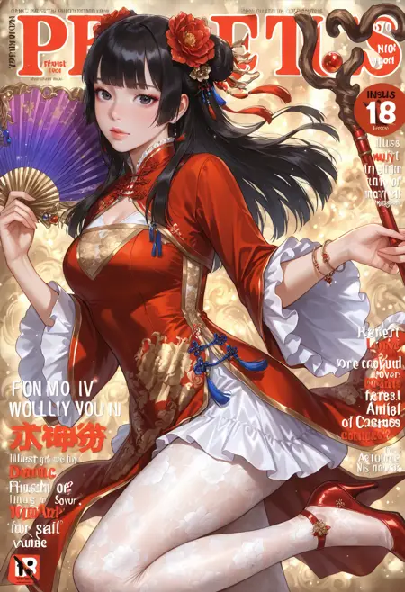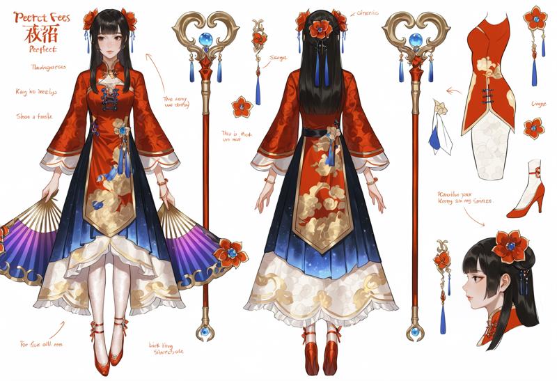 DW8 オリジナル衣装: 1girl,黒い目,ロングヘア,黒髪,前髪,ストレートな前髪,唇,髪飾り,赤い靴,パンティーホース,髪の花,ドレス,白いパンティーホース,ブレスレット,ジュエリー,折りたたみ扇子,ハイヒール,靴,中国風衣装,フリル,スカート,ロングスリーブ,赤いドレス,花柄,手扇子,扇子を持っている,Staff,Staffを持っている