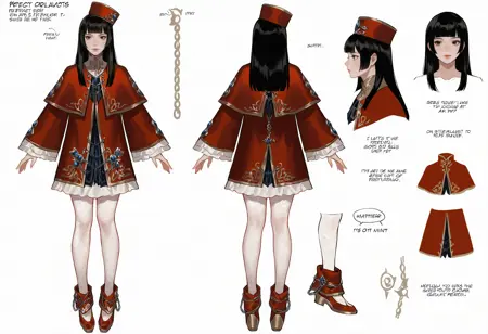 DW6 オリジナル衣装: 1girl,茶色の目,黒い目,黒髪,ロングヘア,ストレートな前髪,前髪,帽子,ロングスリーブ,ドレス,チェーン,赤いドレス,白いパンティーホース,靴,赤い靴,パンティーホース,裸足,カプセル