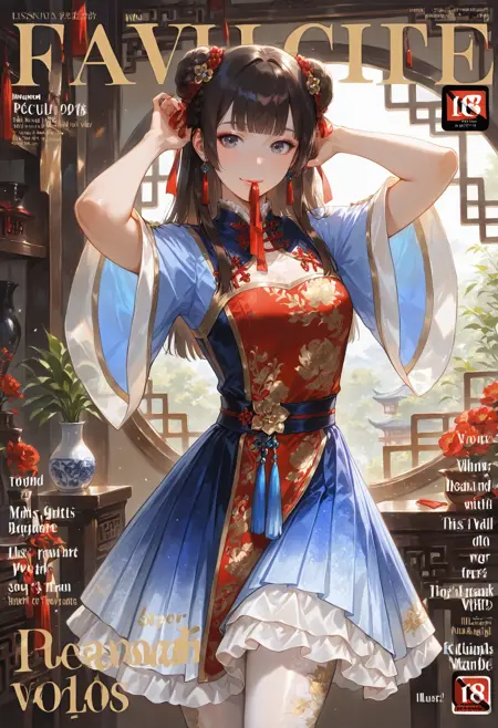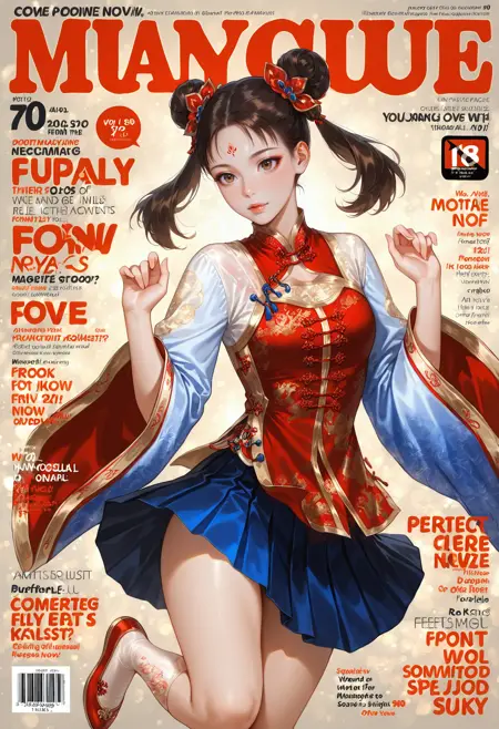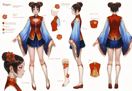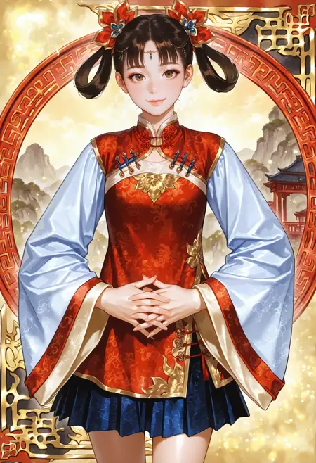 DW3 オリジナル衣装: 1girl,茶色の目,黒髪,ショートヘア,顔の模様,額の模様,茶色の髪,ツインテール,髪の結び目,ダブルバング,膝丈ソックス,靴下,スカート,ロングスリーブ,ワイドスリーブ,靴,中国風衣装,髪飾り,プリーツスカート,青いスカート,ミニスカート