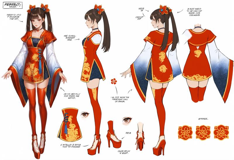 DW2 オリジナル衣装: 1girl,茶色の目,ツインテール,茶色の髪,黒髪,ロングヘア,太ももハイズ,赤い太ももハイズ,プラットフォームシューズ,絶対領域,ロングスリーブ,ドレス,靴,ワイドスリーブ,ハイヒール,髪飾り,中国風衣装,チョーカー,プラットフォームヒール,赤い靴