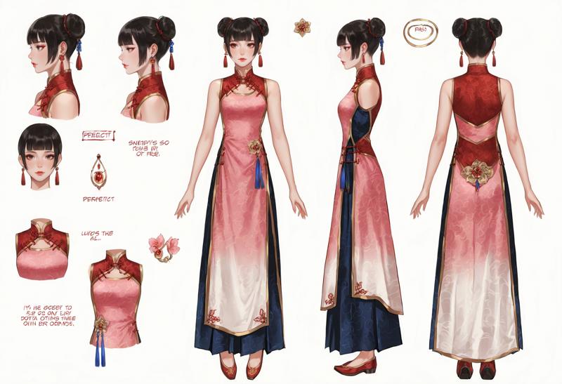カジュアル衣装: 1girl,黒髪,茶色の目,前髪,ショートヘア,肩出し,ストレートな前髪,唇,メイク,髪の結び目,リップスティック,中国風衣装,ドレス,チャイナドレス,ピンクのドレス,ジュエリー,ノースリーブ,イヤリング,靴,袴スカート