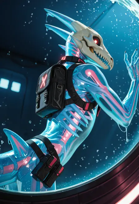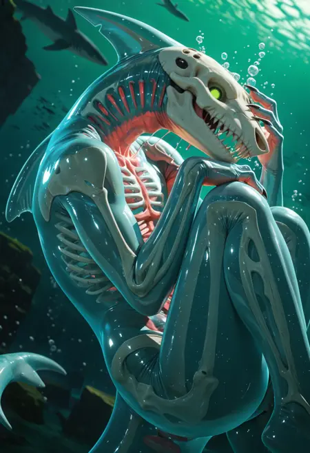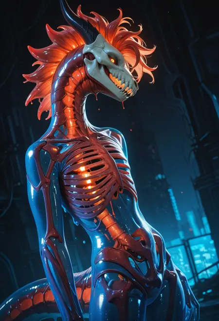 📝 Bone Goo Creatures —— 一种虚构生物,拥有半透明的果冻状身体,可清晰看到发光的骨骼:肋骨、脊椎和四肢骨骼。常具有带角的骷髅状头部。身体不断滴落黏液,如玻璃般反射光线,介于解剖幻想与恋物美学之间。有时穿着极简服饰以强化风格。