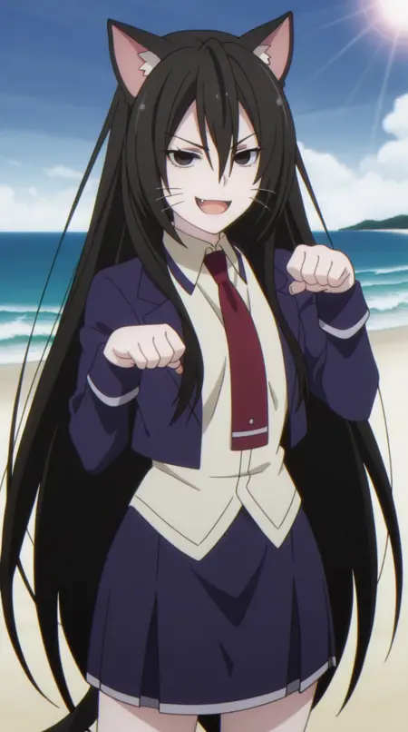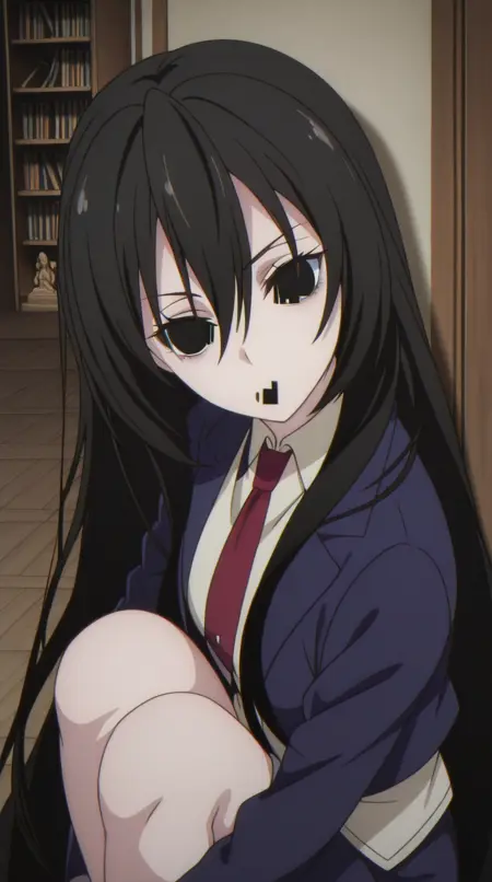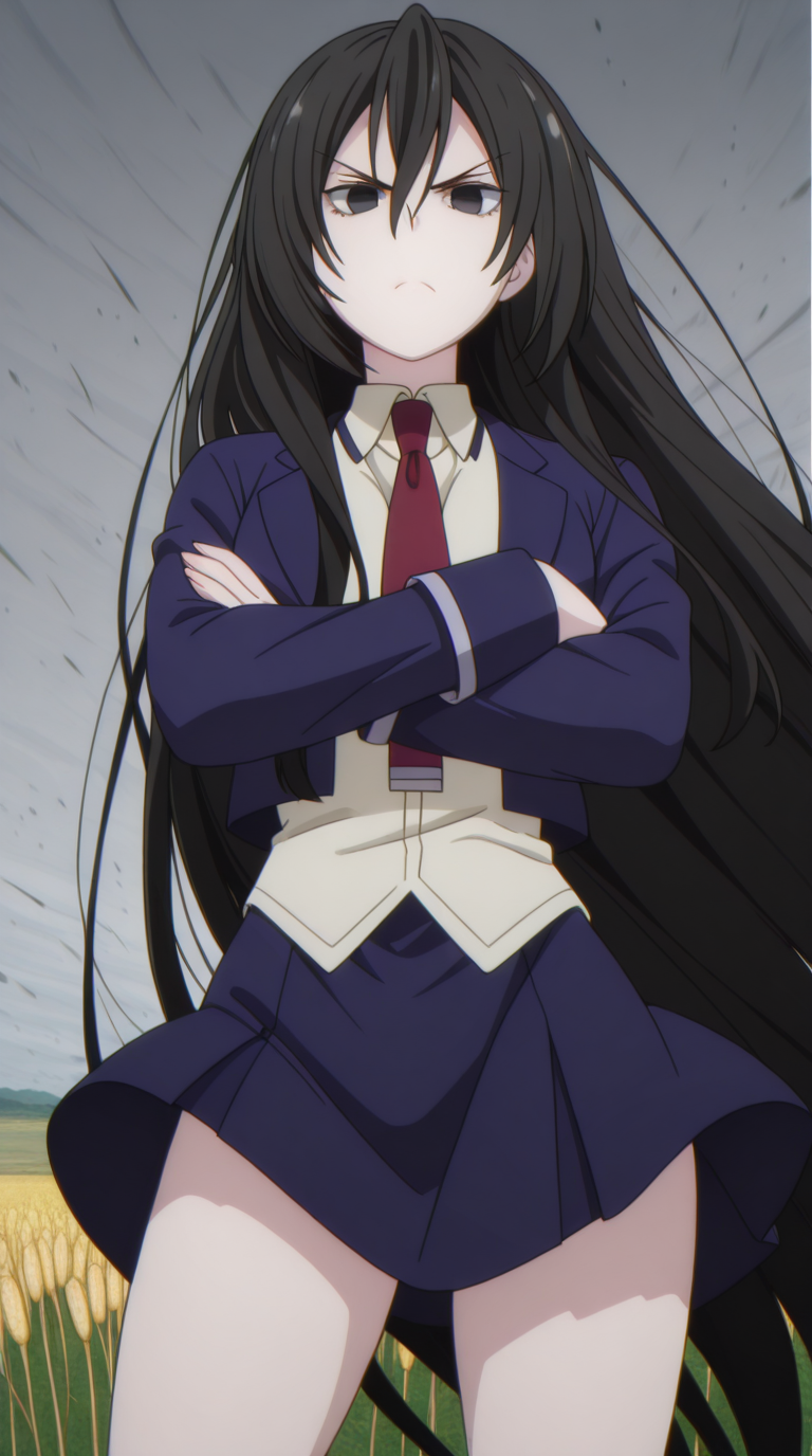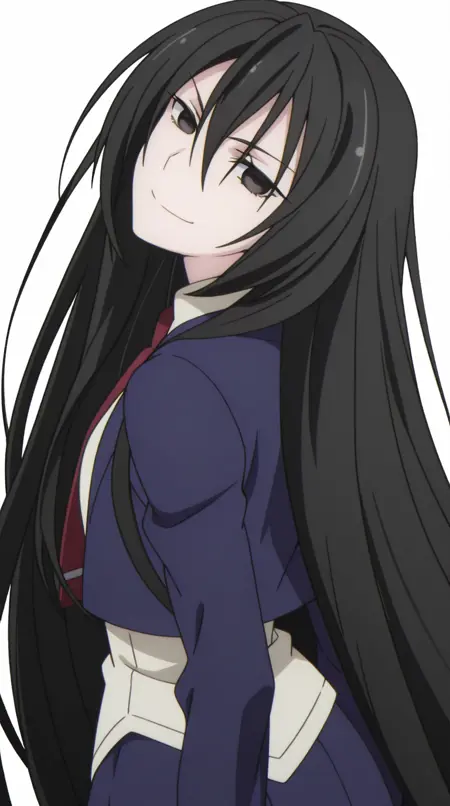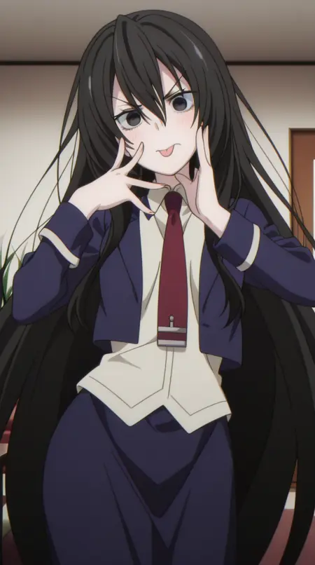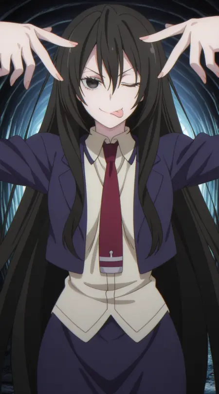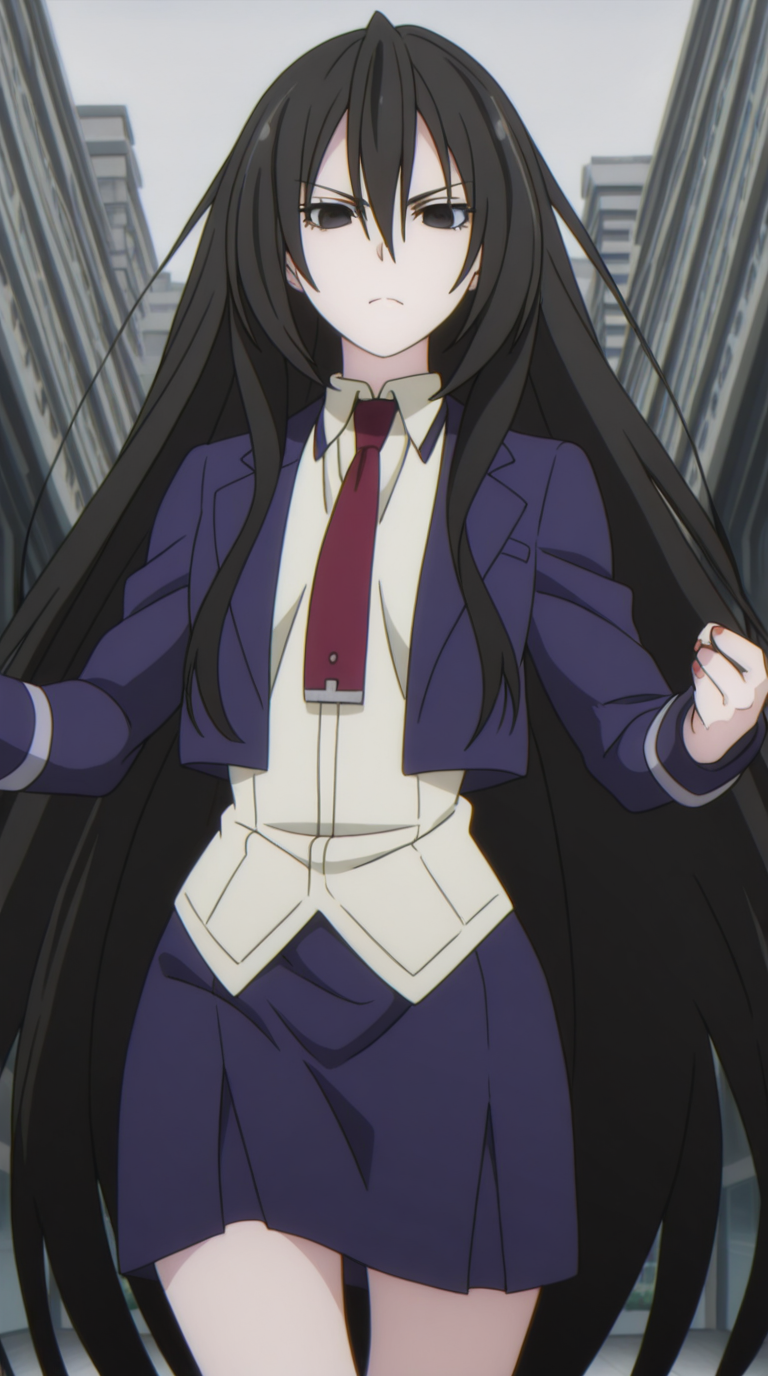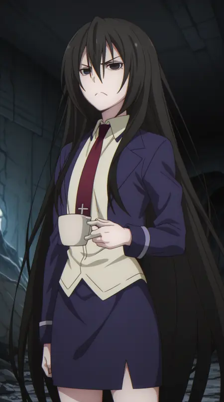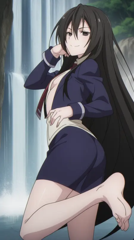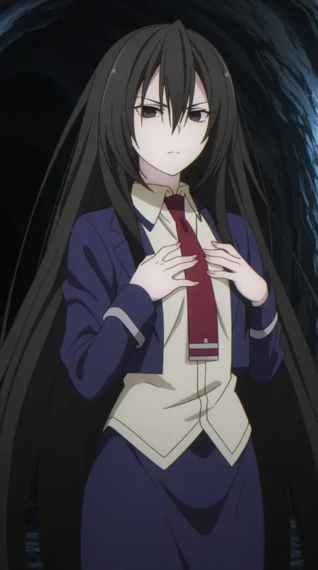 kirukiru amou, long hair, black hair, very long hair, black eyes, hair between eyes, mature female, small breasts, anime screencap