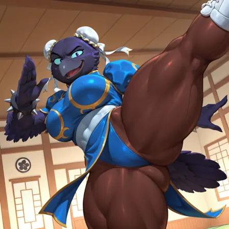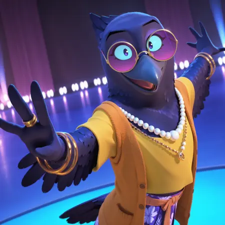 Positive Prompts: DMTBG2, furry female, anthro, avian, bird, raven, black eyebrows, blue sclera, indigo eyes, purple body, purple feathers, feathered arms, feathered tail